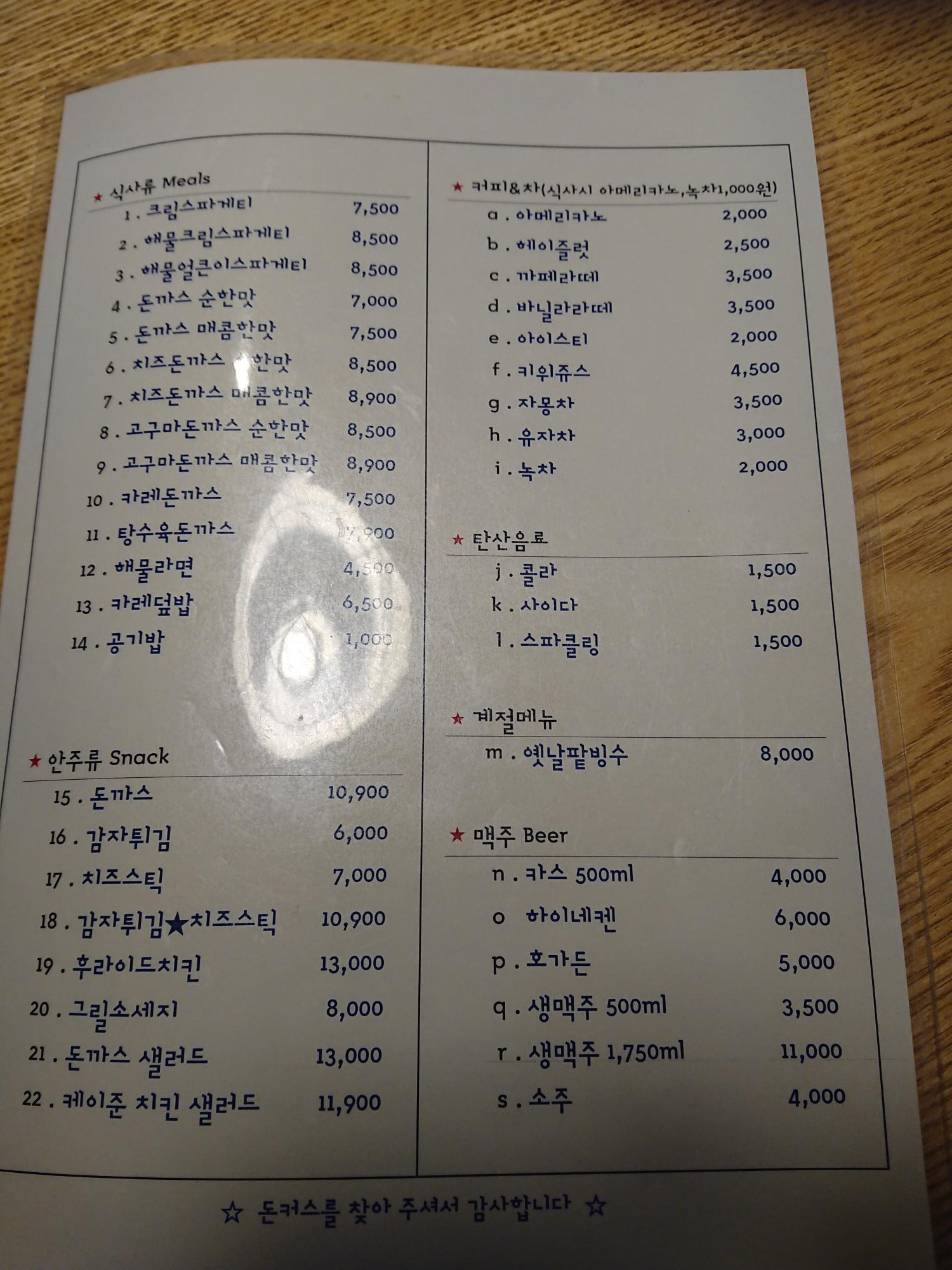 메뉴판을 보면 총 5종류의 돈까스를 볼 수 있습니다.