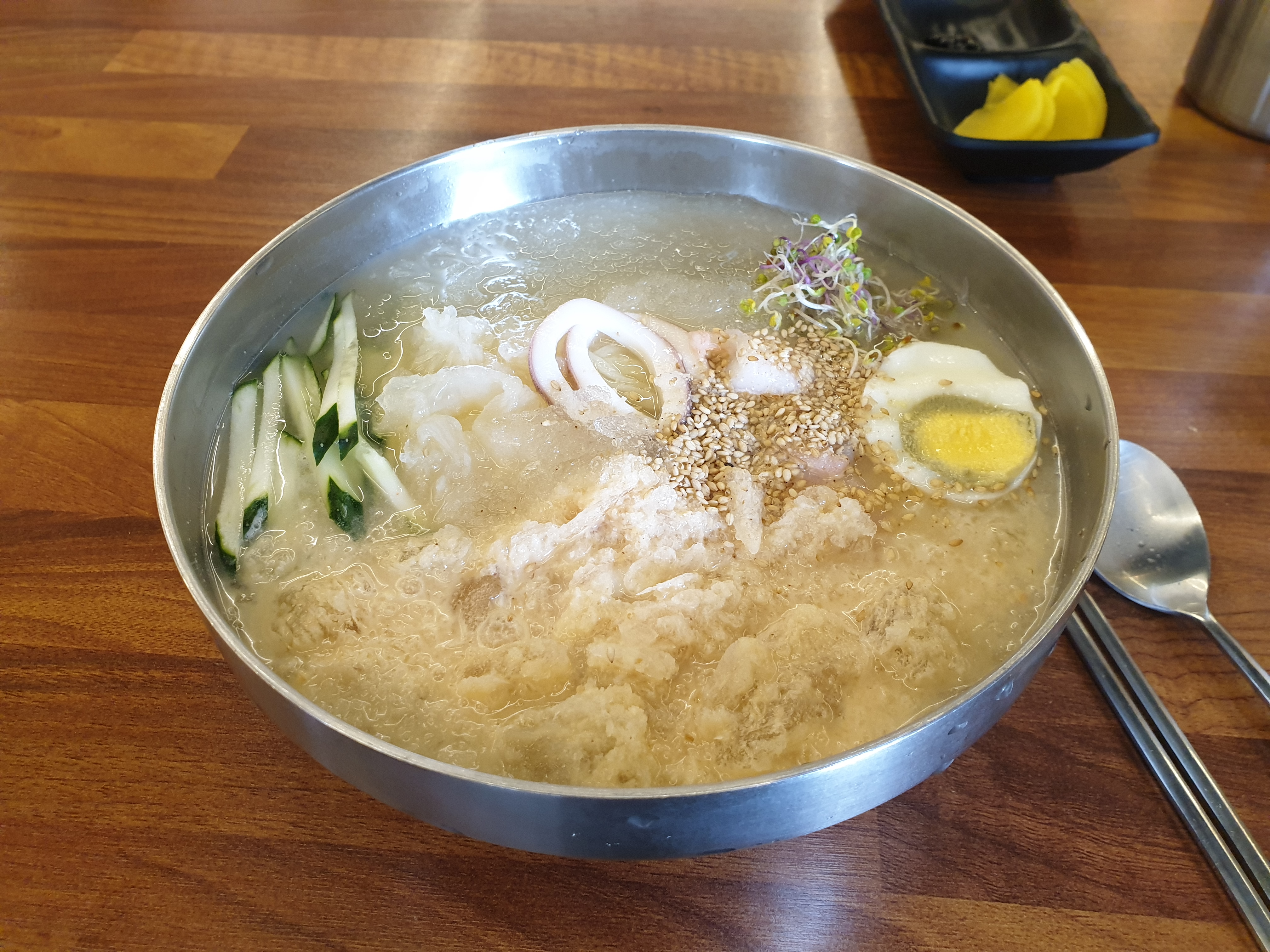 거기에다 냉면처럼 삶은 계란을 고명으로 올리고, 해산물을 얹어놨네요.