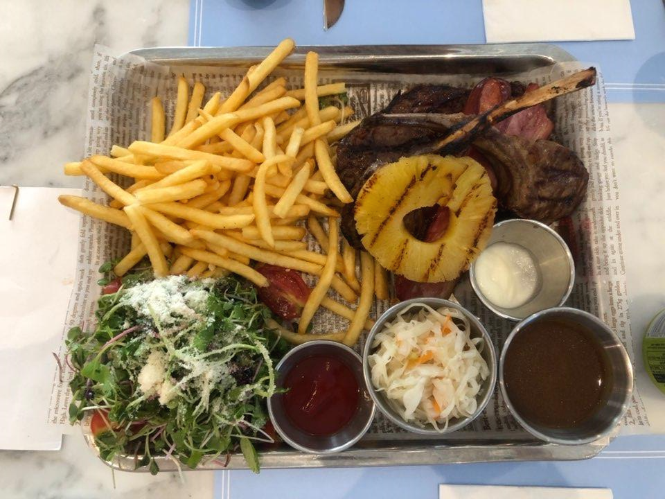 등심과 양갈비, 소시지, 베이컨, 감자튀김, 계절샐러드, 코올솔로, 케찹, 데미글라스소스가 플레이팅되는데요.