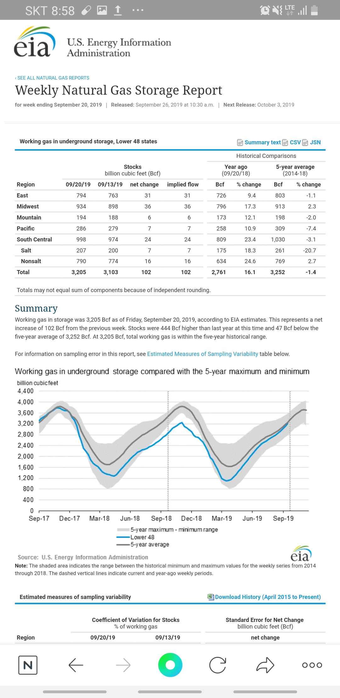 연초에 미국 에너지 관리청(Energy Information Administration, EIA 미국 에너지부에 속하는 통계 및 분석청)에서 수요와 공급을 바탕으로한 분석에서 올겨울 천연가스 가격이 3달러/MMBtu를 예상하고 있습니다.