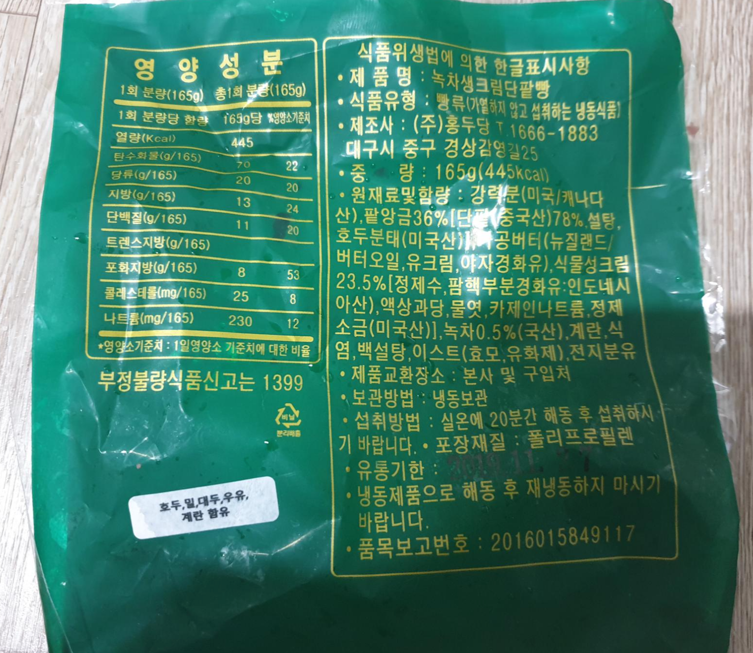 포장의 뒷면에 영양성분과 정보입니다.