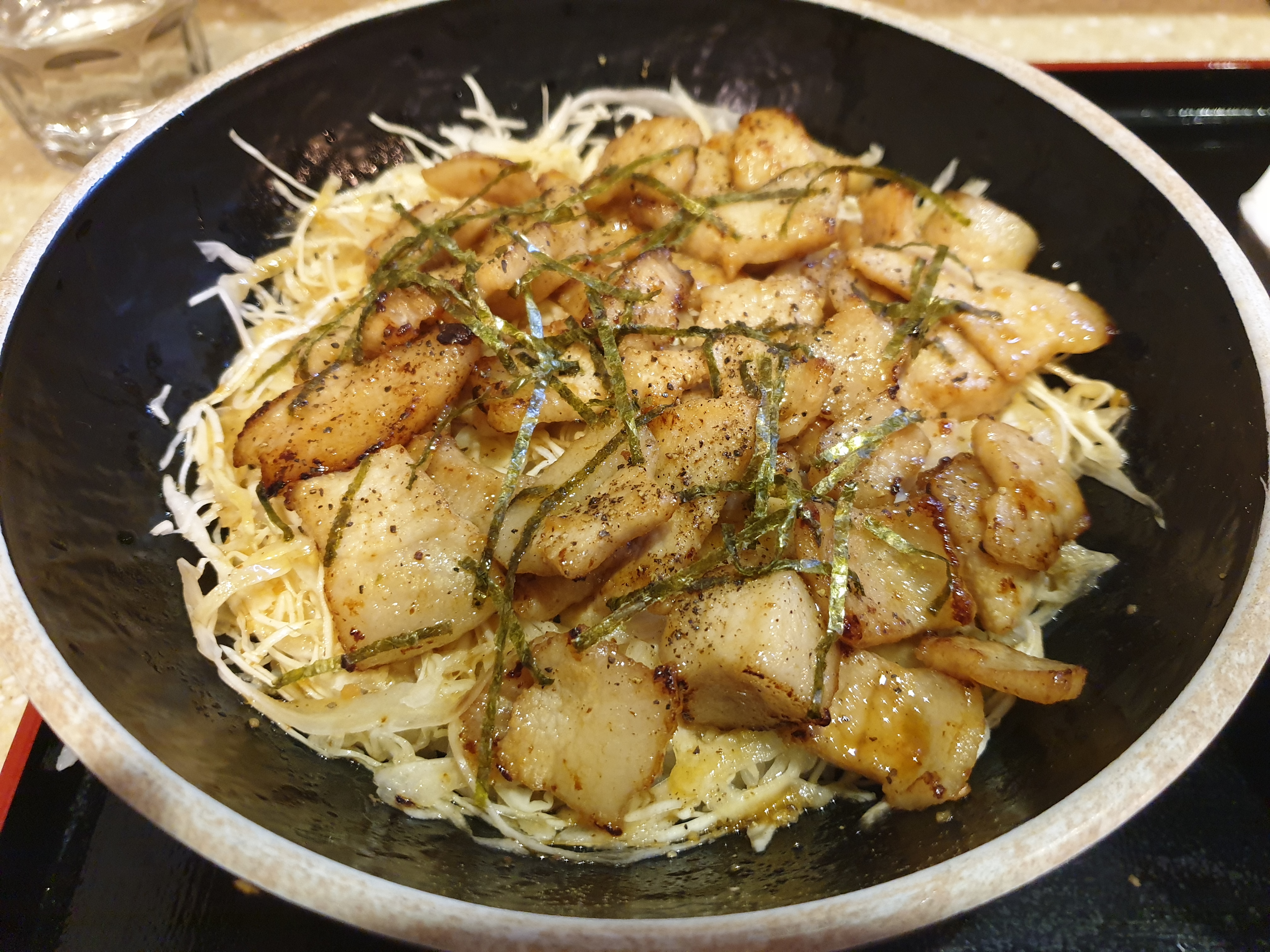 미야꼬 우동의 돈토로 덮밥은 항정살과 함께 양배추 그리고 간장 소스로 토핑되어 있어요.