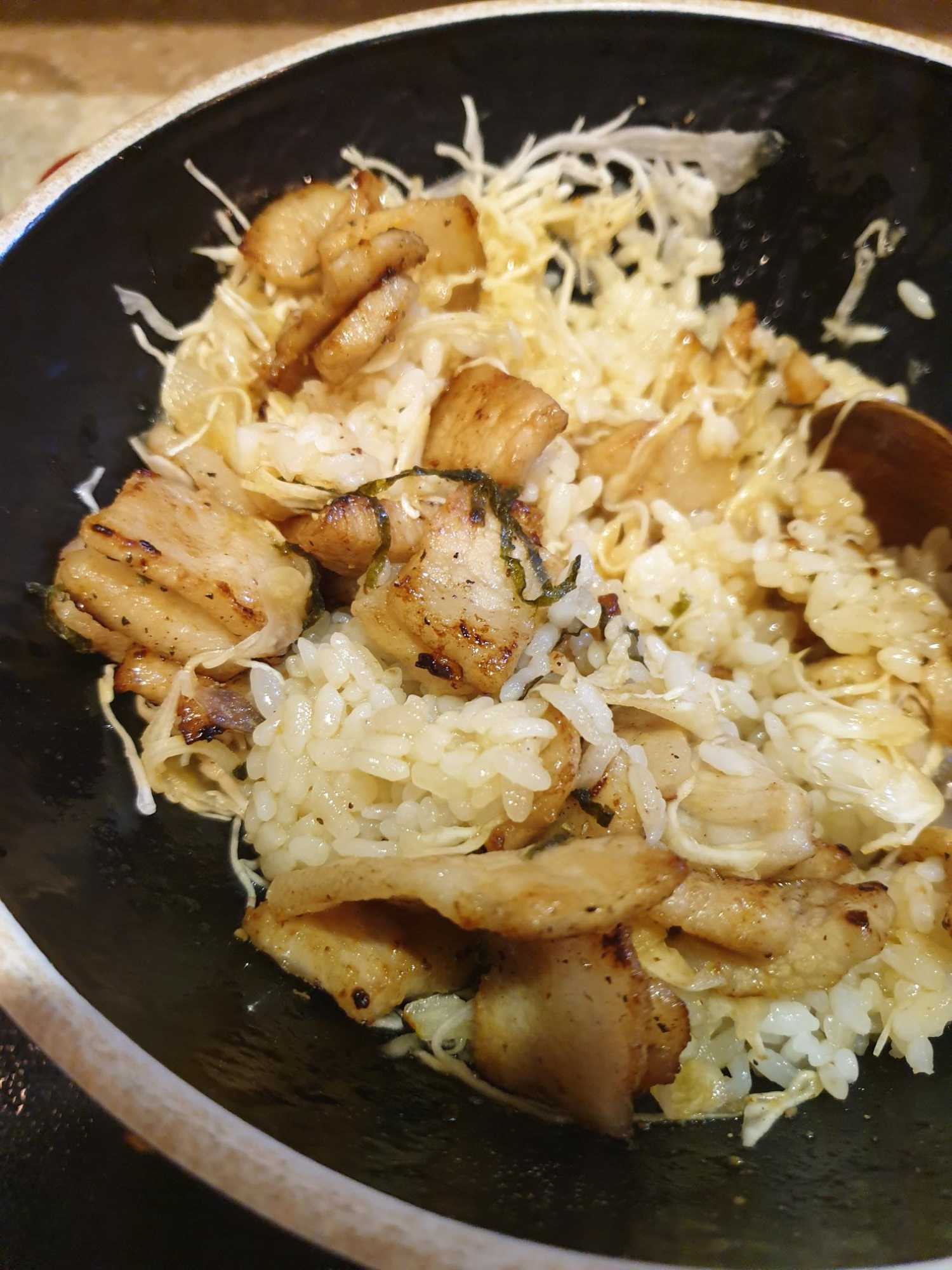항정살과 함께 양배추 그리고 간장소스를 흰쌀밥과 비벼 먹으면,