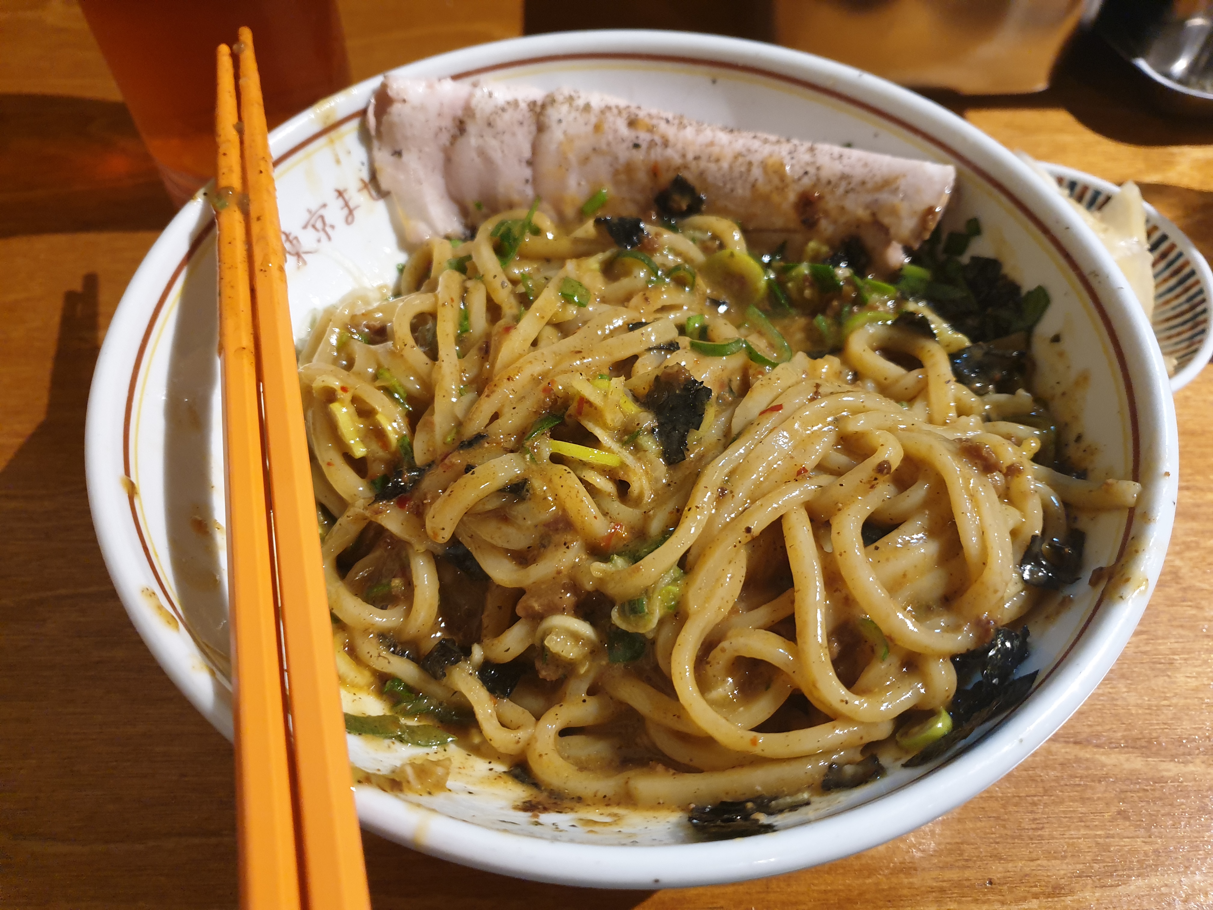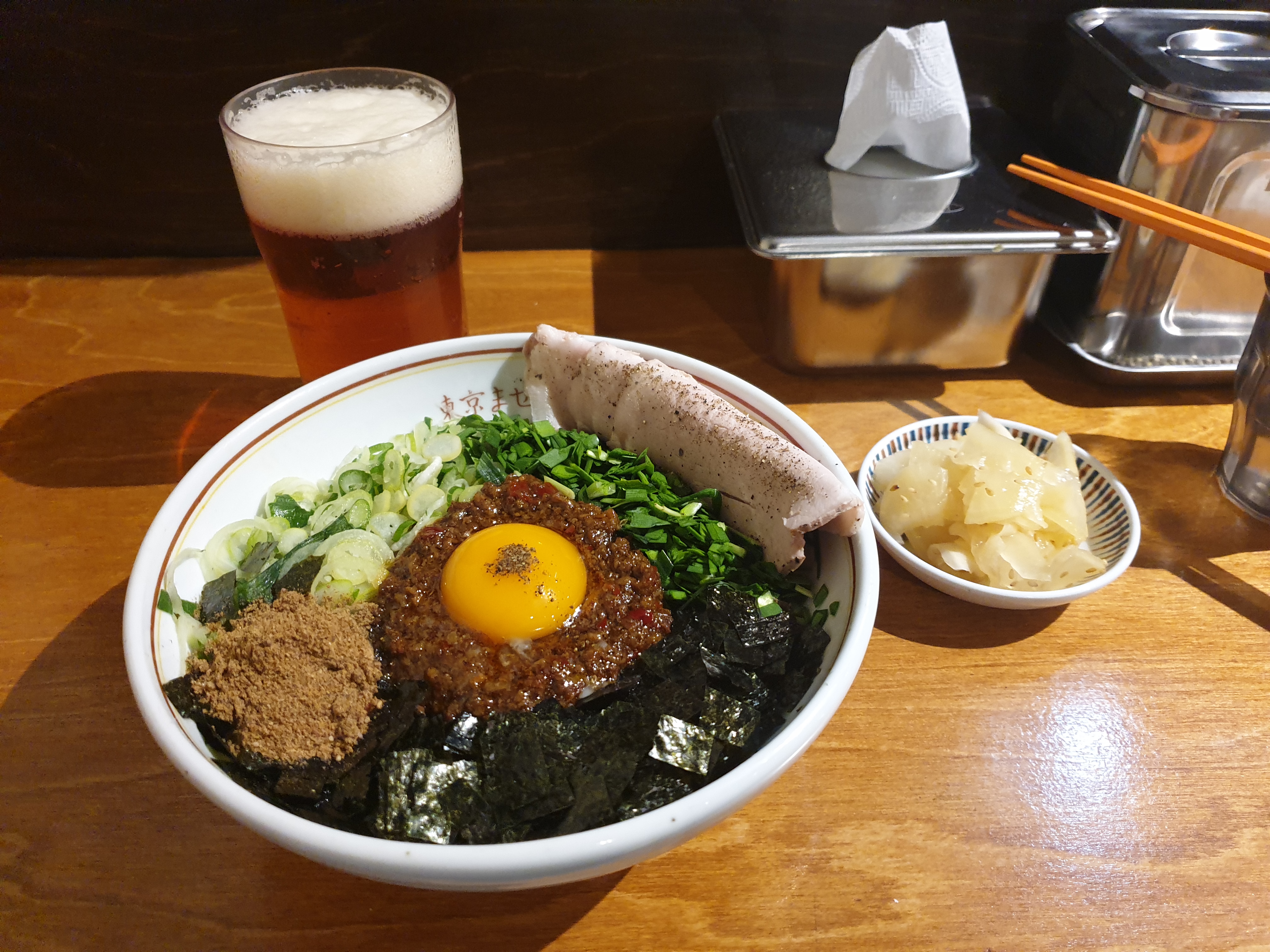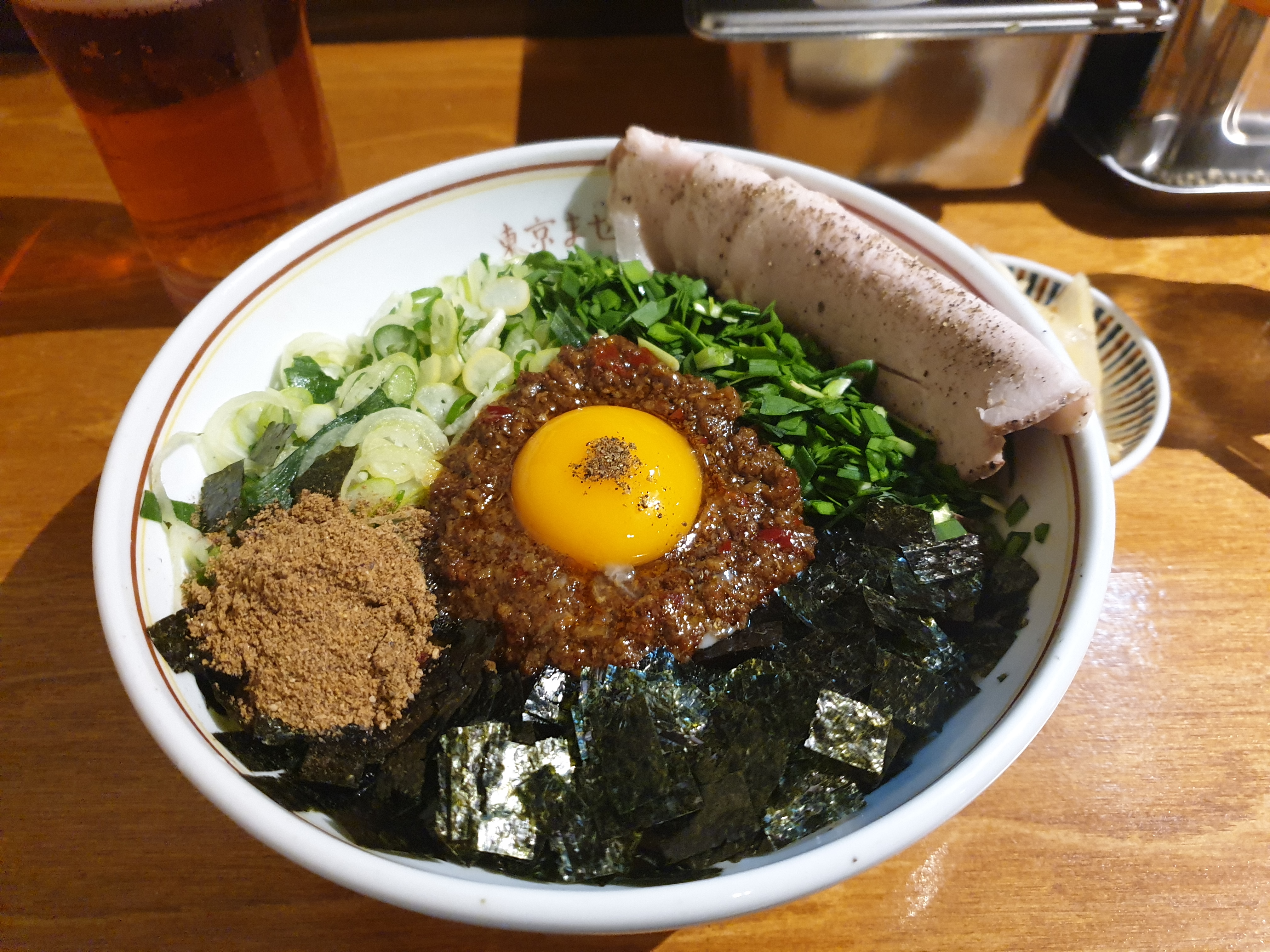 국물 없는 면에 고기, 채소, 계란 등 다양한 고명과 소스를 비며 먹는 라멘입니다.