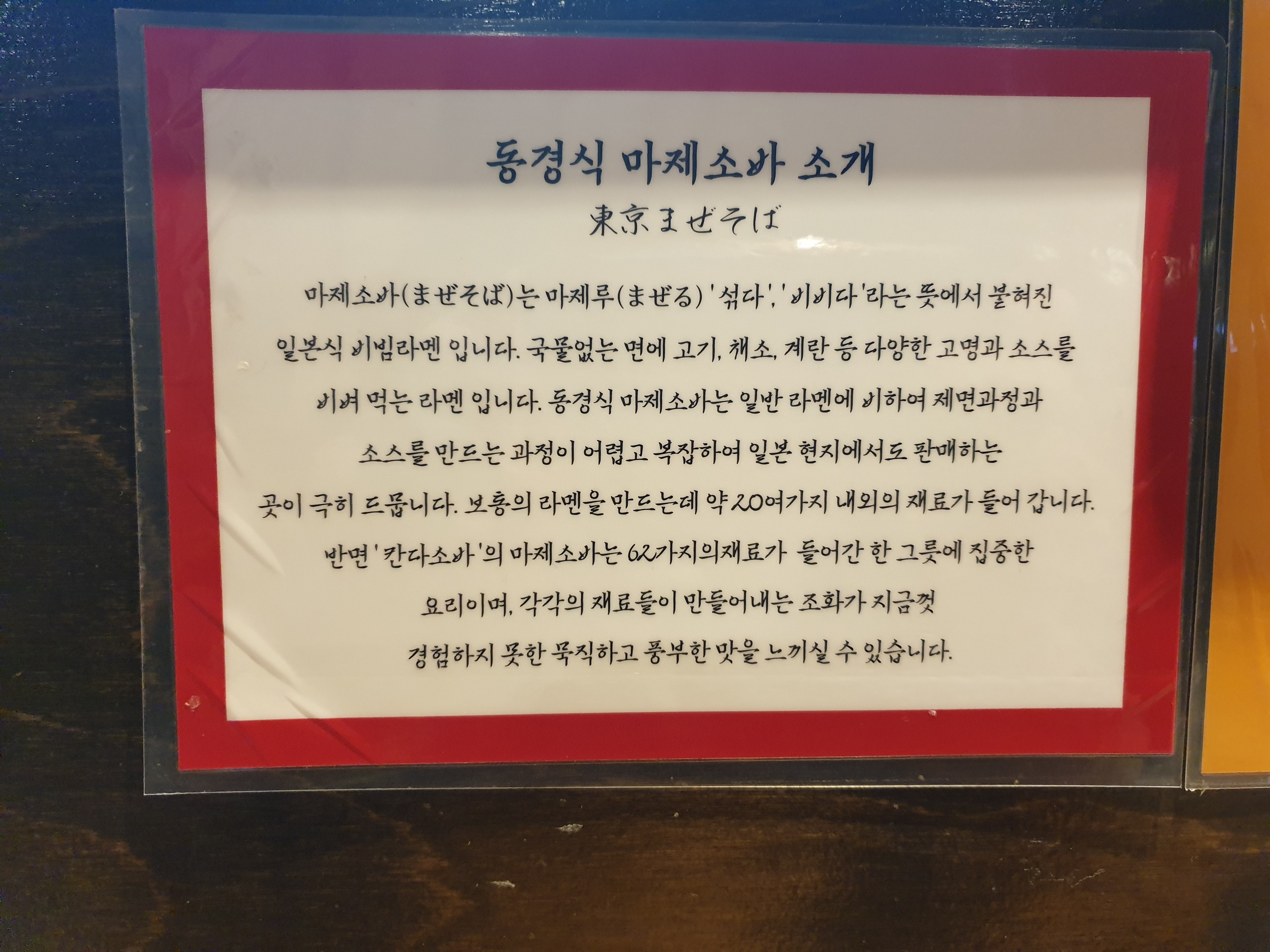 테이블에 보면 동경식 마제소바에 대한 소개가 있습니다.