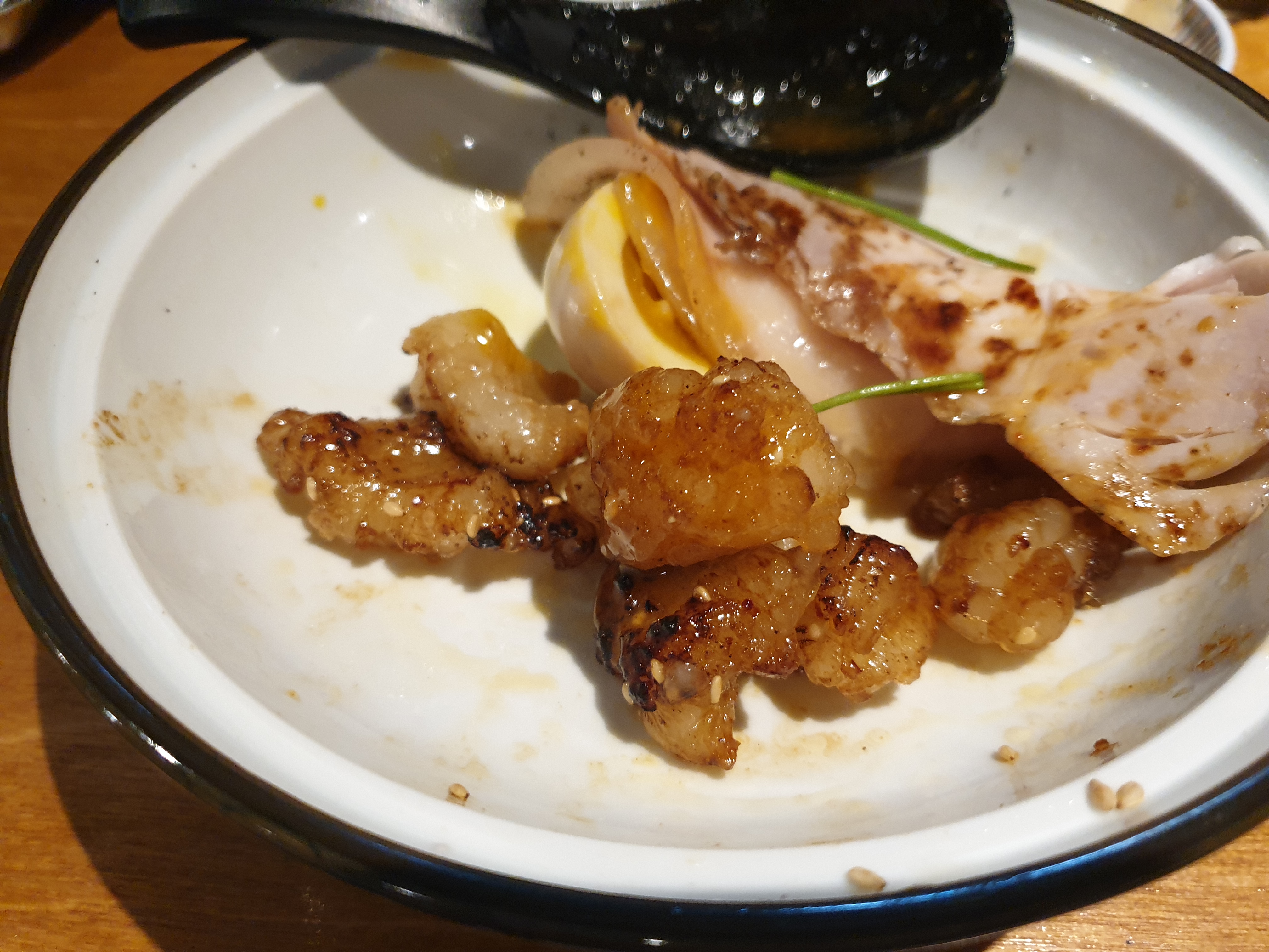 3.차슈, 대창(호르몬), 맛계란(아지타마고), 김을 차례로 면과 함께 츠케지루(육수)에 찍어서 먹습니다.