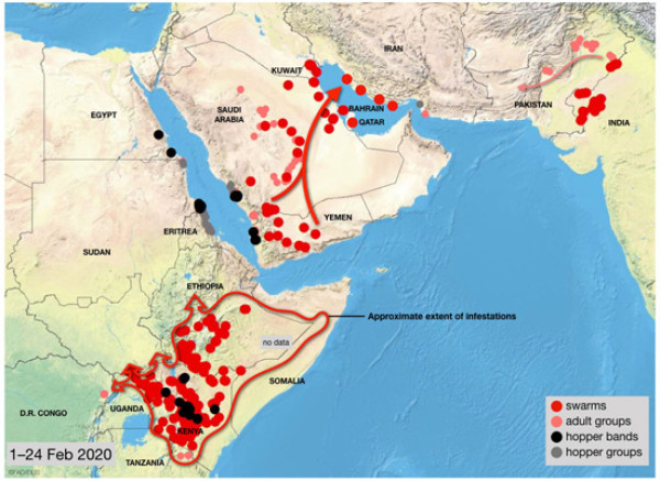 바로 아프리카에서 발원한 사막메뚜기떼입니다.