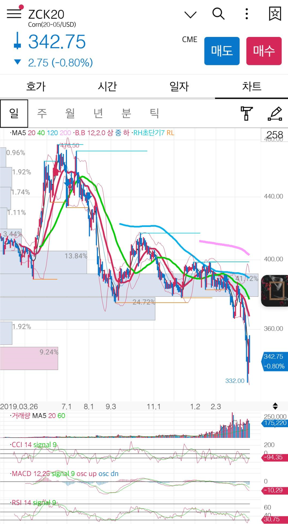 현재 미국옥수수선물은 코로나19로 인한 소비감소, 저유가로 인한 소비감소로 저점을 갱신하고 있습니다.