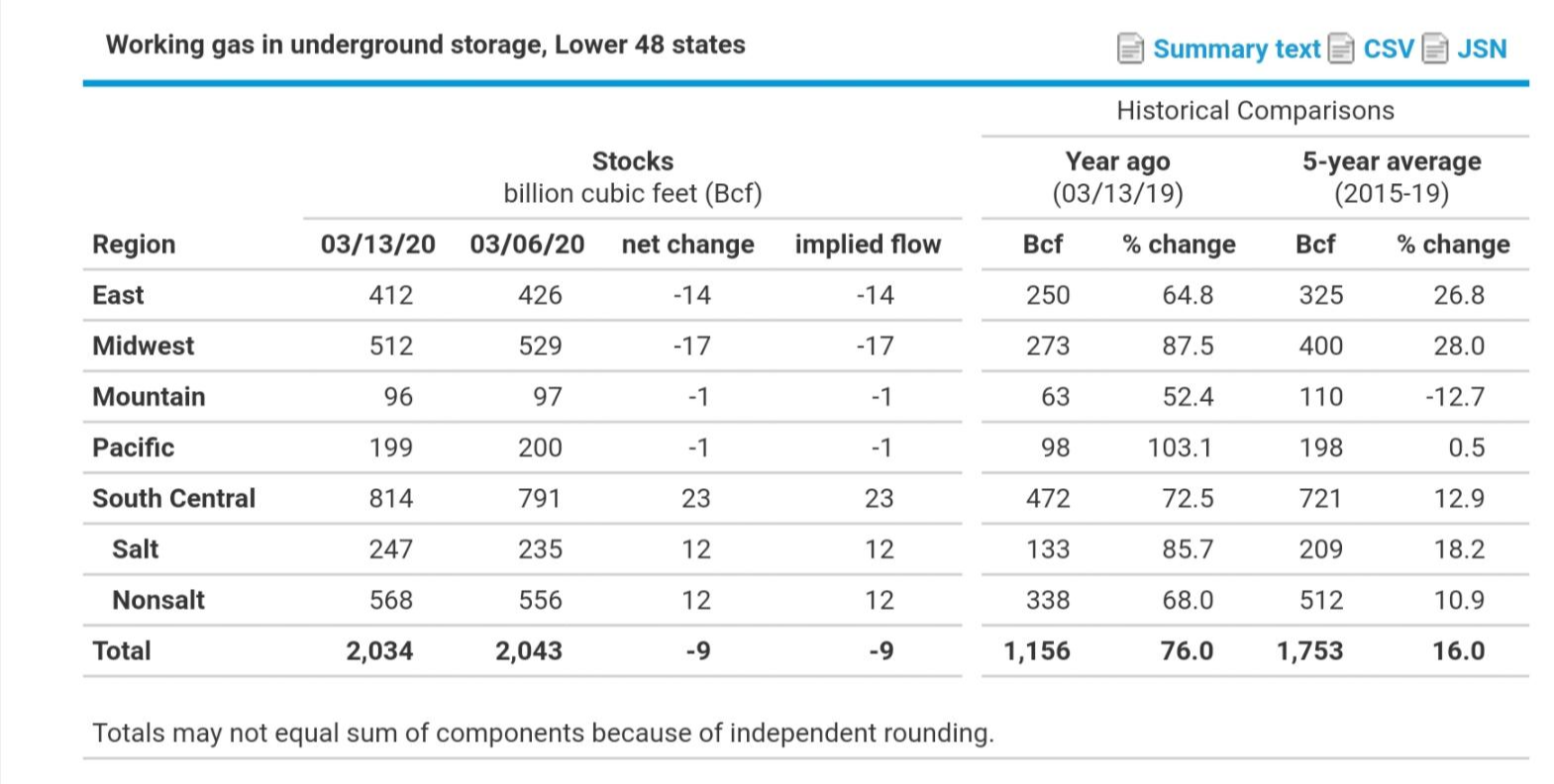 며칠 전인 3월 19일(미국시간기준) EIA에서 발표한 재고량 표를 보면 3/6~3/13까지의 재고 소비는 9BCF로