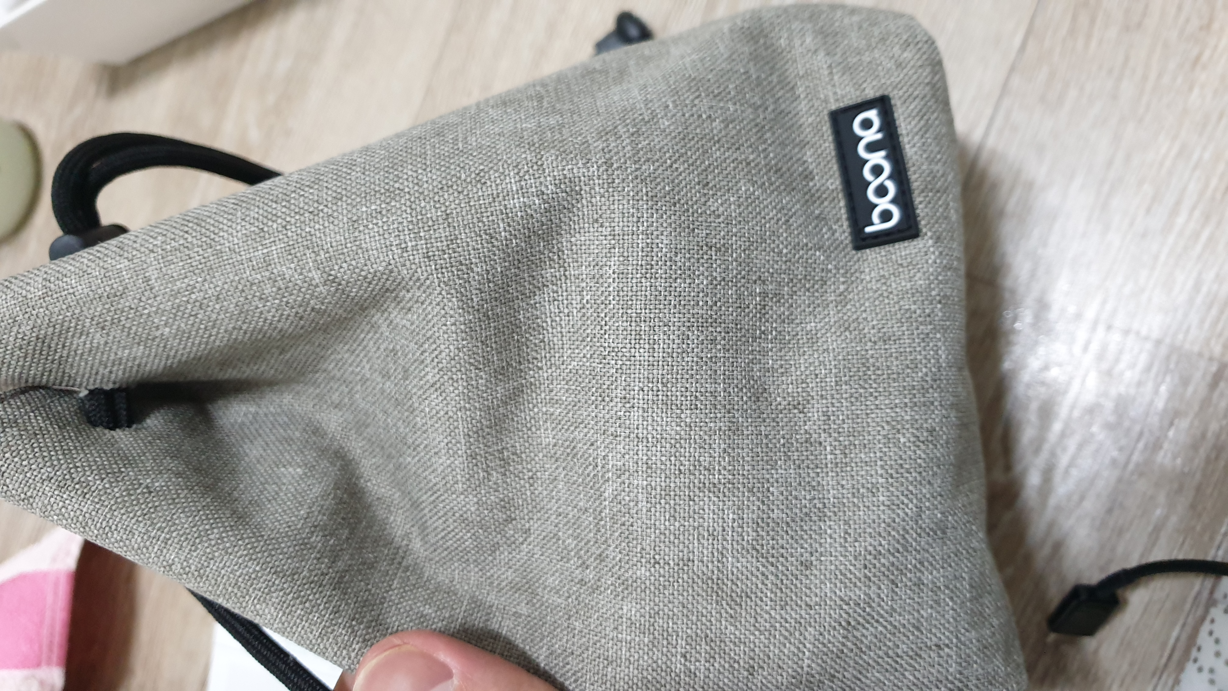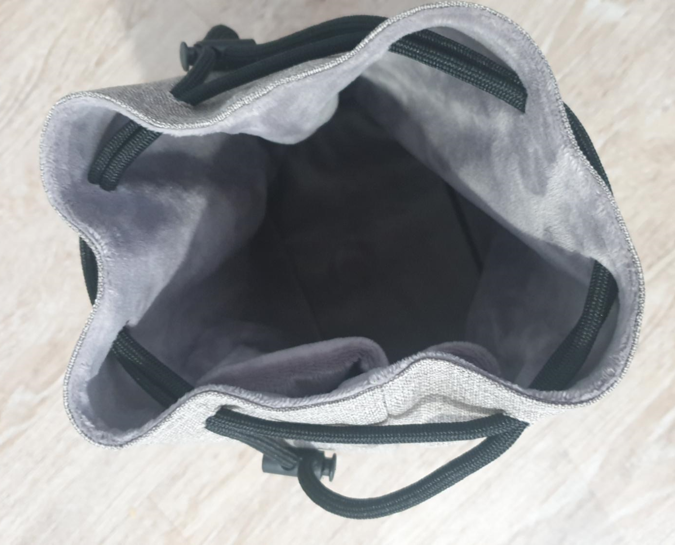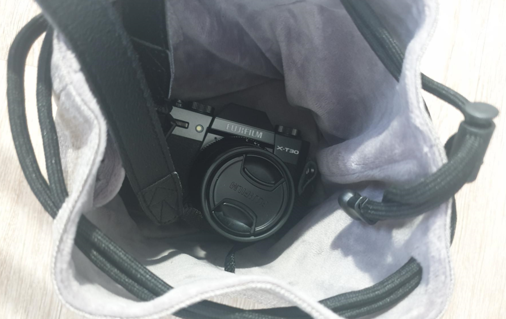 카메라를 파우치 안에 넣고 끈을 당겨 놨을때 모습입니다.