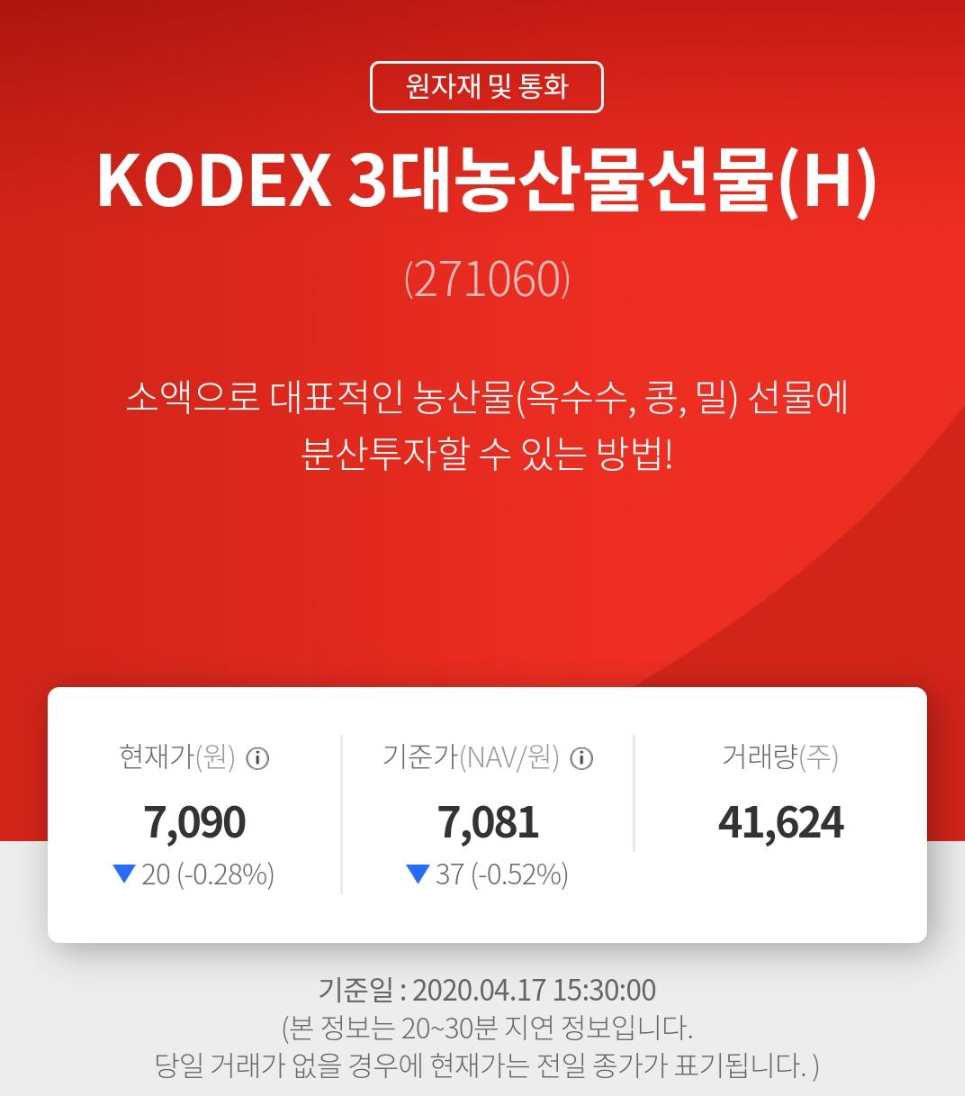 2020/04/19 - [투자일지/농산물투자] - (투자진행중)TIGER 농산물선물Enhanced(H)137610/코스피 - 농산물투자시작