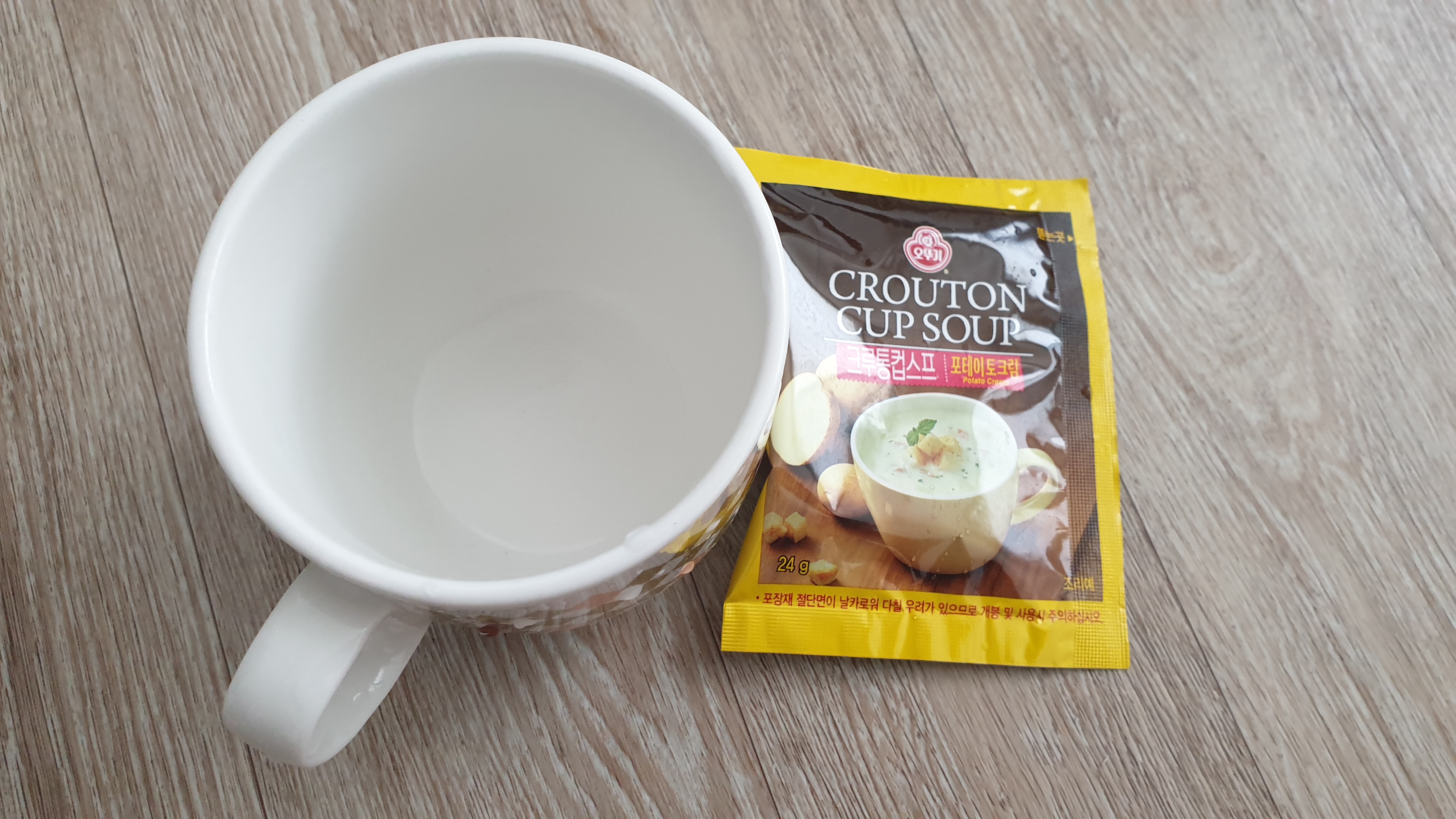 머그컵에 크루통컵스프를 붇어봤어요.
