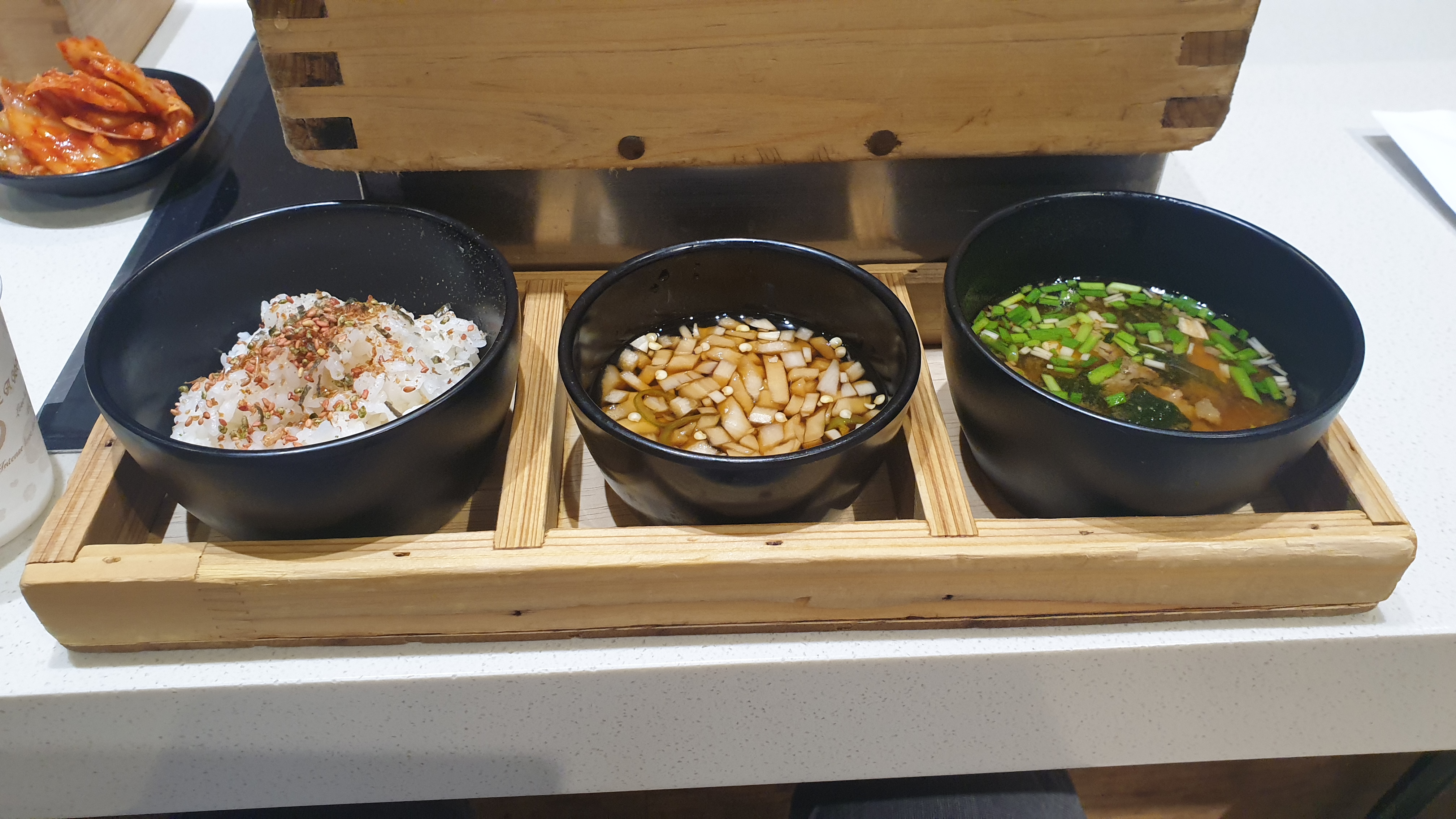 미소 된장국과 고기를 찍어먹을 수 있는 간장 소스와 밥이 기본으로 나옵니다.