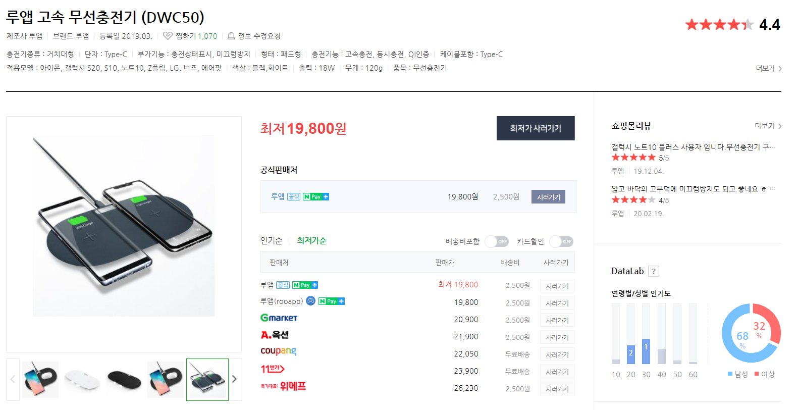 다양한 제품이 많기는 한데 그 중에서 루앱(ROOAPP)의 고속 무선 패드/충전기(DWC50)가 눈에 띄더군요.