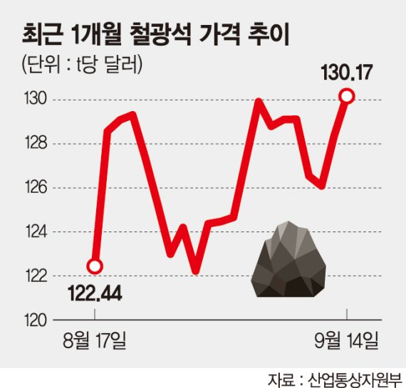 16일 산업통상자원부 원자재자격정보에 따르면 지난 14일 기준 철광석 가격은 t당 130.17달러를 기록하며 130달러선을 돌파했다. 4월 t당 80달러에서 오르기 시작한 가격이 단 5개월여만에 60% 넘게 치솟았다. t당 130달러선은 지난달 이후 철광석 가격의 심리적 저항선으로 작용해 왔다.