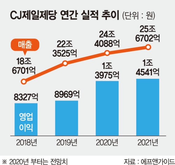 금융정보업체 에프앤가이드에 따르면 CJ제일제당의 지난해 영업이익 컨센서스(증권사 평균 추정치)는 1조3975억원으로, 전년(8969억원) 대비 55.82% 급증할 전망이다.