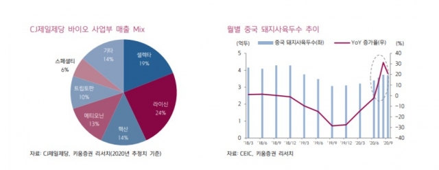조상훈 삼성증권 연구원은 "CJ제일제당의 바이오 사업은 확장 중에 있어 곡물가격 상승이 긍정적인 측면이 많다"며 "아프리카돼지열정(ASF) 영향 안정화 및 중국 돼지사육두수 회복 사이클 진입으로 바이오 강세는 올해 지속될 가능성이 높다"고 말했다.