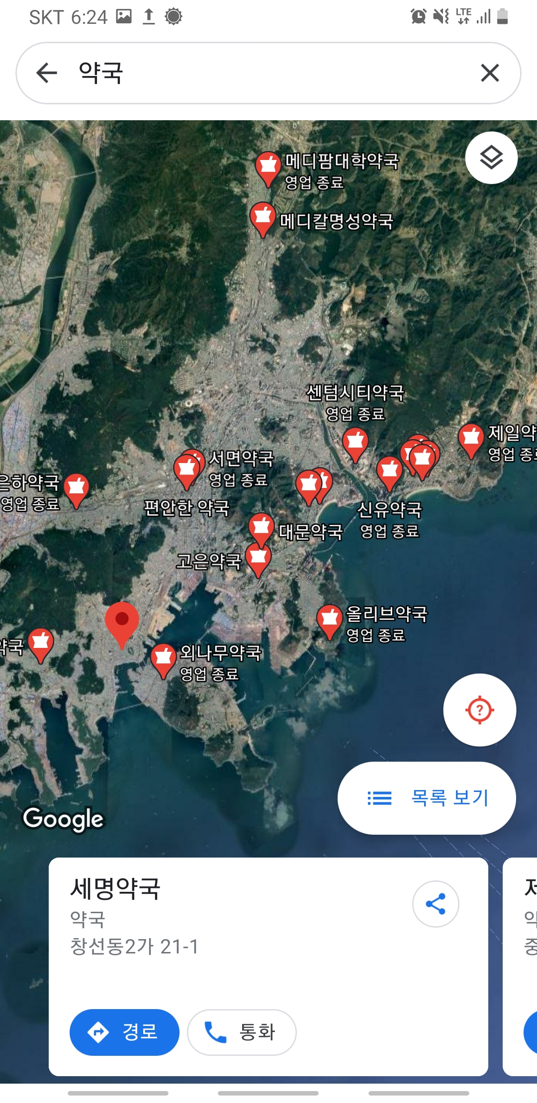 약국을 검색하면 위성지도 위에 약국이 표시됩니다.