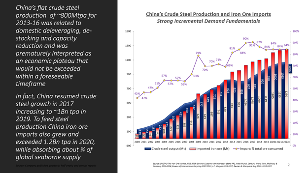 철강 생산량의 '고점'은 3 ~ 4 년 (2013 ~ 2016 년) 동안 지속되었으며 중국이 과도한 부채를 디 레버 리징하고 재고를 줄이고 용량을 줄이려는 노력과 일치했습니다. 재정 집 청소가 완료됨에 따라 중국은 점진적인 성장을 재개했으며 2020 년까지 조강 생산량이 1Bn tpa를 초과하여 이전 고원 정점보다 2 억 tpa 증가했습니다! 이 건강한 성장은 철광석 시장에 영향을 미쳤으며 2020 년까지 새로운 슈퍼 사이클의 회복과 새벽을위한 환경을 제공합니다. 이는 불과 몇 년 전에는 상상할 수 없었던 기회입니다. 실제로 철강 생산량은 정점기에 평준화되었지만 철광석 수입 증가는 멈추지 않았습니다.