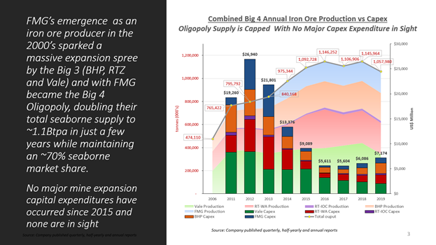 불과 몇 년 사이에 빅4는 철광석 생산을 2배 이상 증가시켜 1억 파운드 이상의 생산량을 달성했고 FOBC1 현금 비용은 약 US$15/t로 감소시켜 잠재적인 신규 시장 진입자들을 심각하게 제한했다. 그들은 현물 가격이 지난 슈퍼 사이클의 절정기 근처 어디에도 돌아오지 않을 것으로 예상될 정도로 원가를 낮게 책정했고 상황은 장기화된 바닥과 긴 회복의 길에 대한 비관적인 전망을 확립했다. 다만 빅4는 2015년 이전부터 신규 주요 증설자본(자본을 유지하는 것 외)을 투입하지 않아 중국 수요가 계속 증가하는 동안 신규 공급이 중단됐다.