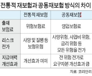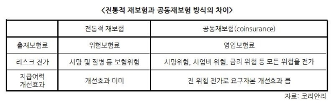 공동재보험은 보험사의 자산과 부채를 모두 떠안는 재보험이다. 코리안리 등이 지금까지 국내 보험사에 제공했던 전통적인 재보험과 다르다. 전통적 재보험은 보험가입자가 계약한 내용 중 사망이나 질병이 실제로 발생할 때 돈을 대주는 정도의 역할로 원 보험사가 일부 리스크를 전가할 수는 있지만, 금리 하락 리스크 등 지급여력비율(RBC)에 영향을 미치는 리스크를 다 넘길 수는 없었다.