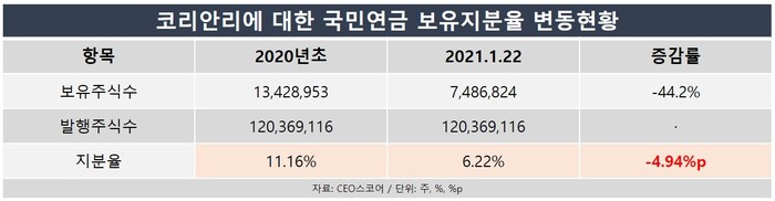 29일 기업평가사이트 CEO스코어가 지난 22일 기준 국민연금이 5% 이상 지분을 보유한 상장사 275곳의 국민연금 지분 현황을 조사한 결과, 코리안리에 대한 국민연금 보유지분율은 현재 6.22%로 집계됐다.