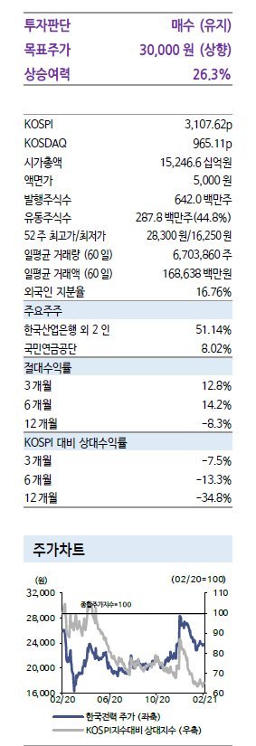 강동진 현대차증권 연구원은 22일 한국전력 목표주가를 기존 3만 원에서 2만7천 원으로 낮춰 잡았다. 투자의견은 시장수익률(Marketperform)로 유지했다.