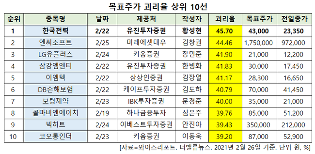 최근 증권사에서 발표된 종목 가운데 한국전력(015760)의 목표주가 괴리율이 가장 높은 것으로 나타났다.