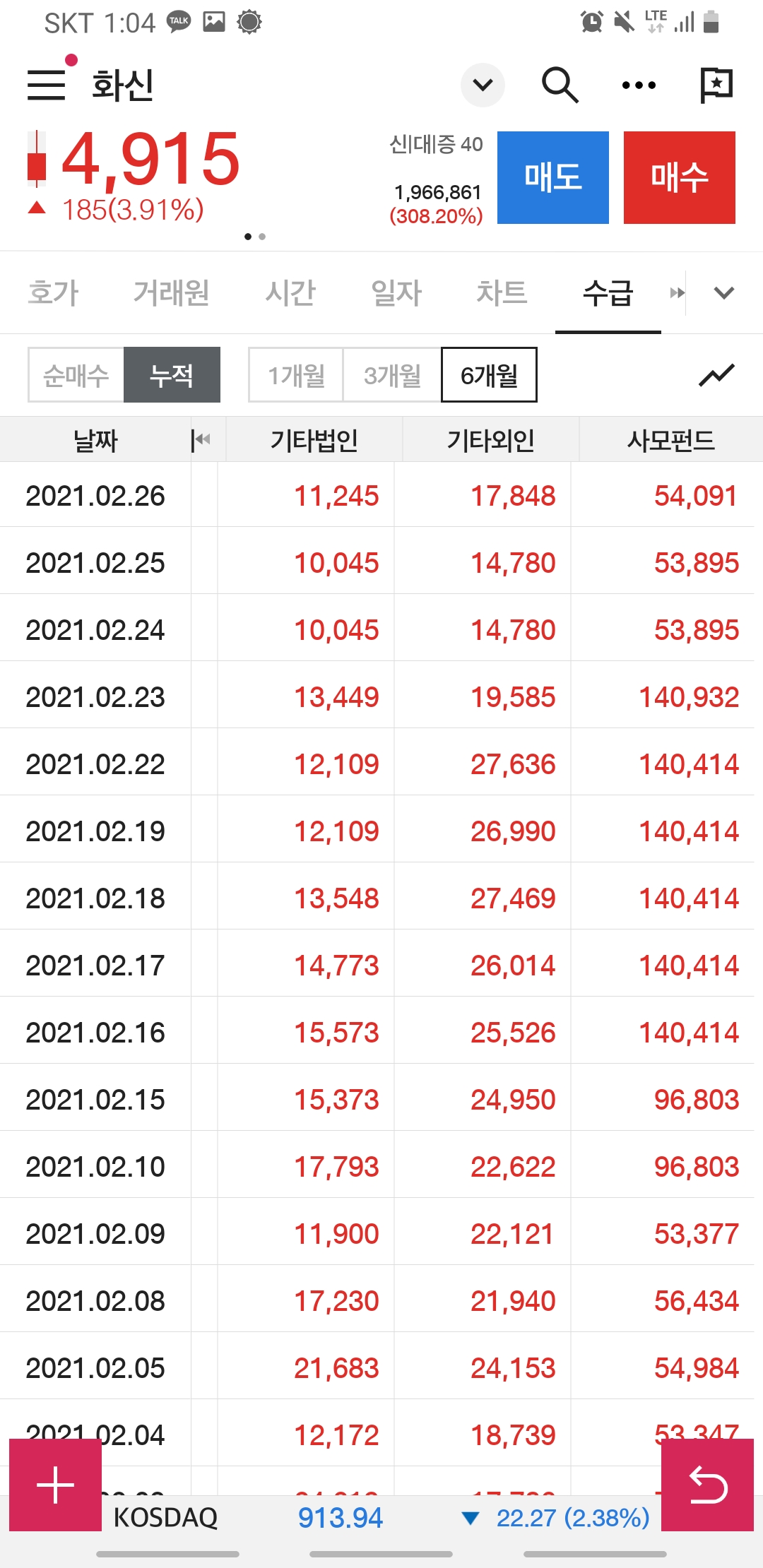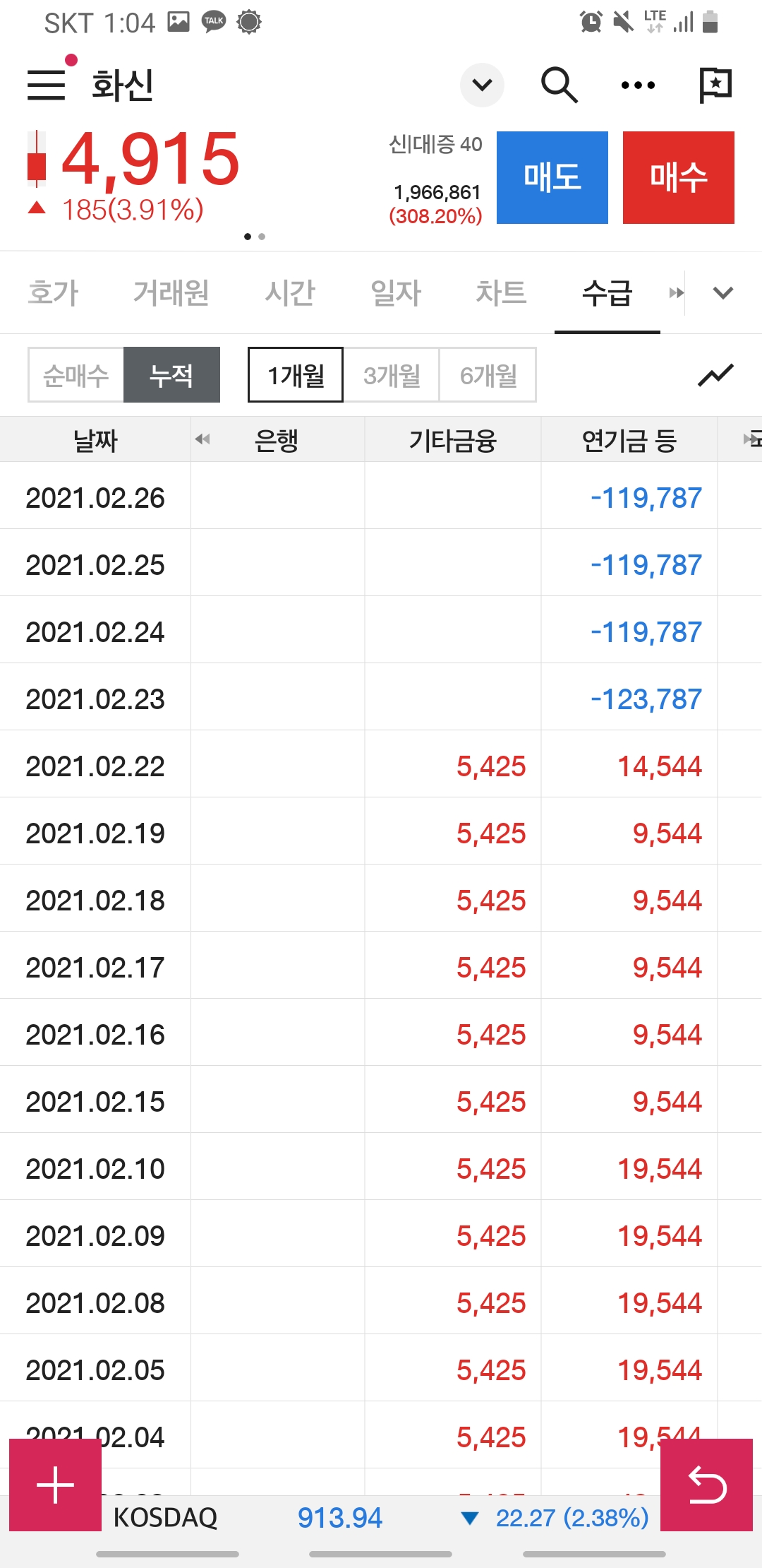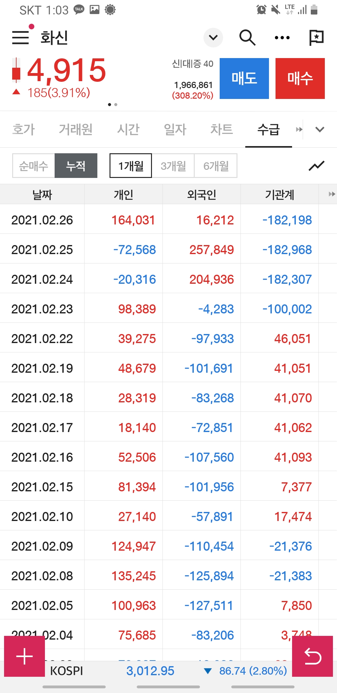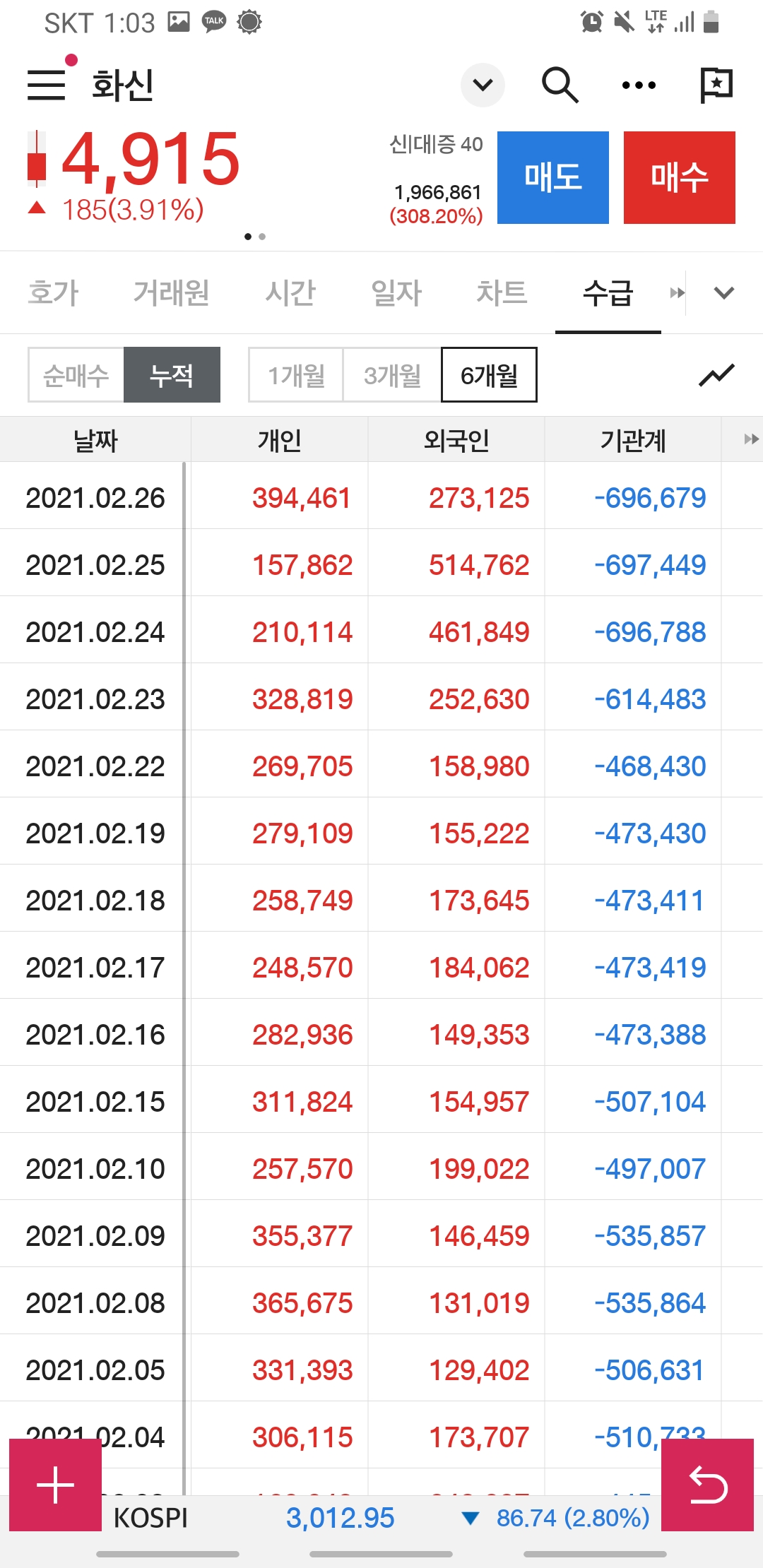 매수 누적 1개월, 3개월, 6개월 전부를 봐도 외국인 기관들의 관심에서 멀어지는 듯합니다.