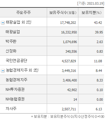 태광실업 외 2인 43.42%(17,748,202주)
