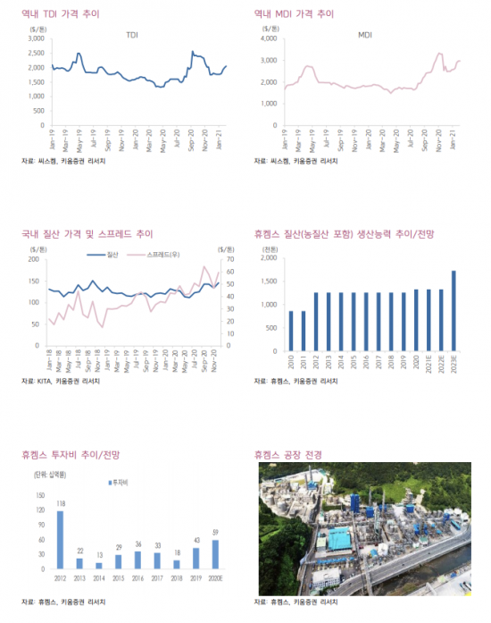 휴켐스는 질산 및 그 다운스트림의 시장 지배력 강화를 위하여 1500억원을 투자해 질산 6공장(40만t)을 2023년 상반기까지 증설할 계획이다. 국내 질산 업체들의 플랜트 스크랩 전망과 초안 업체 증설 검토에 따른 국내 질산의 수급 부족 현상을 대비한 것으로 추정된다. 이번 증설로 휴켐스의 질산(농질산포함) 생산능력은 173만t으로 증가하며 역내 1위 공업용 질산 업체 지위를 지속할 것으로 보인다. 또한 증설로 인한 단위당 고정비 축소 등 규모의 경제효과가 추가되며 외형 및 플랜트 경쟁력이 더욱 강화될 전망이다.