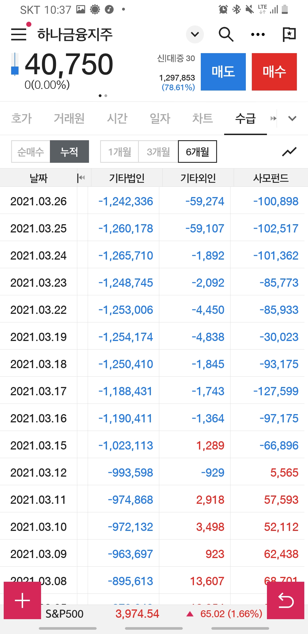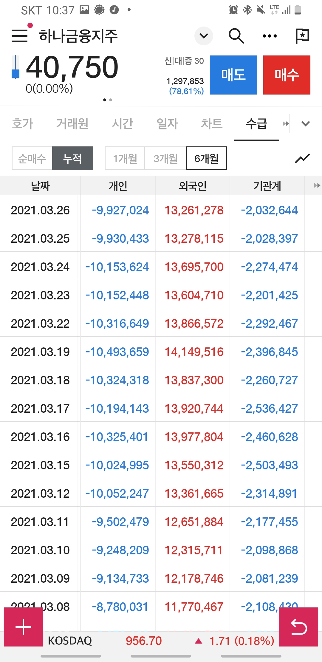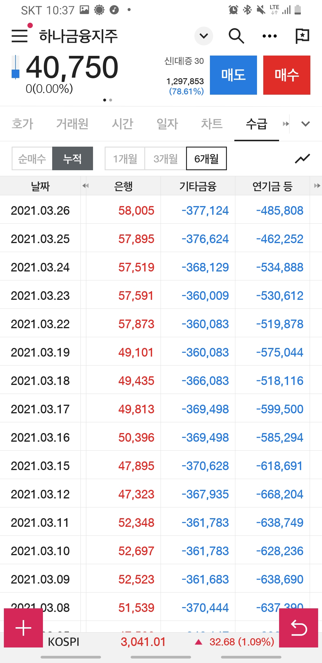 6개월 거래 누적동향에서는 연기금, 보험등등 매도세가 뚜렸했지만요.