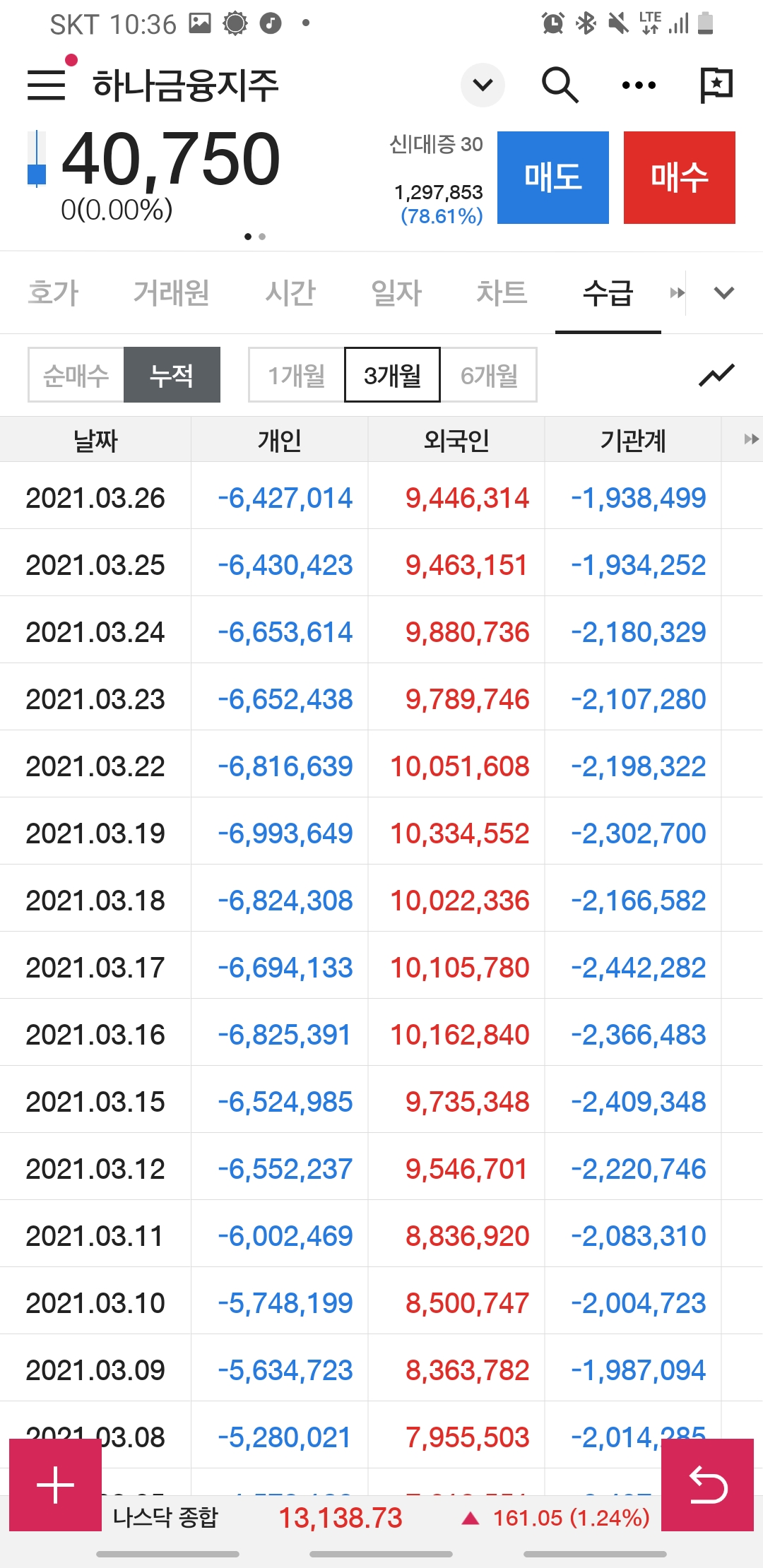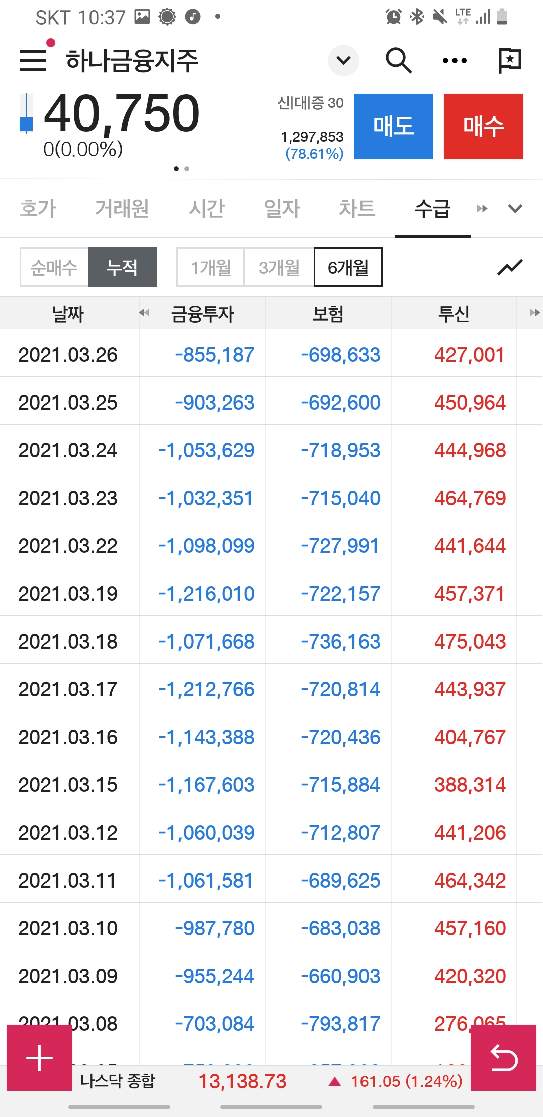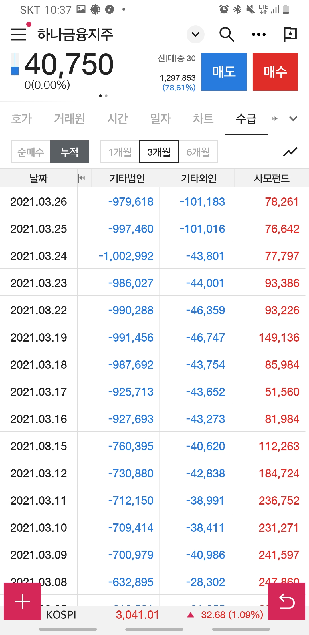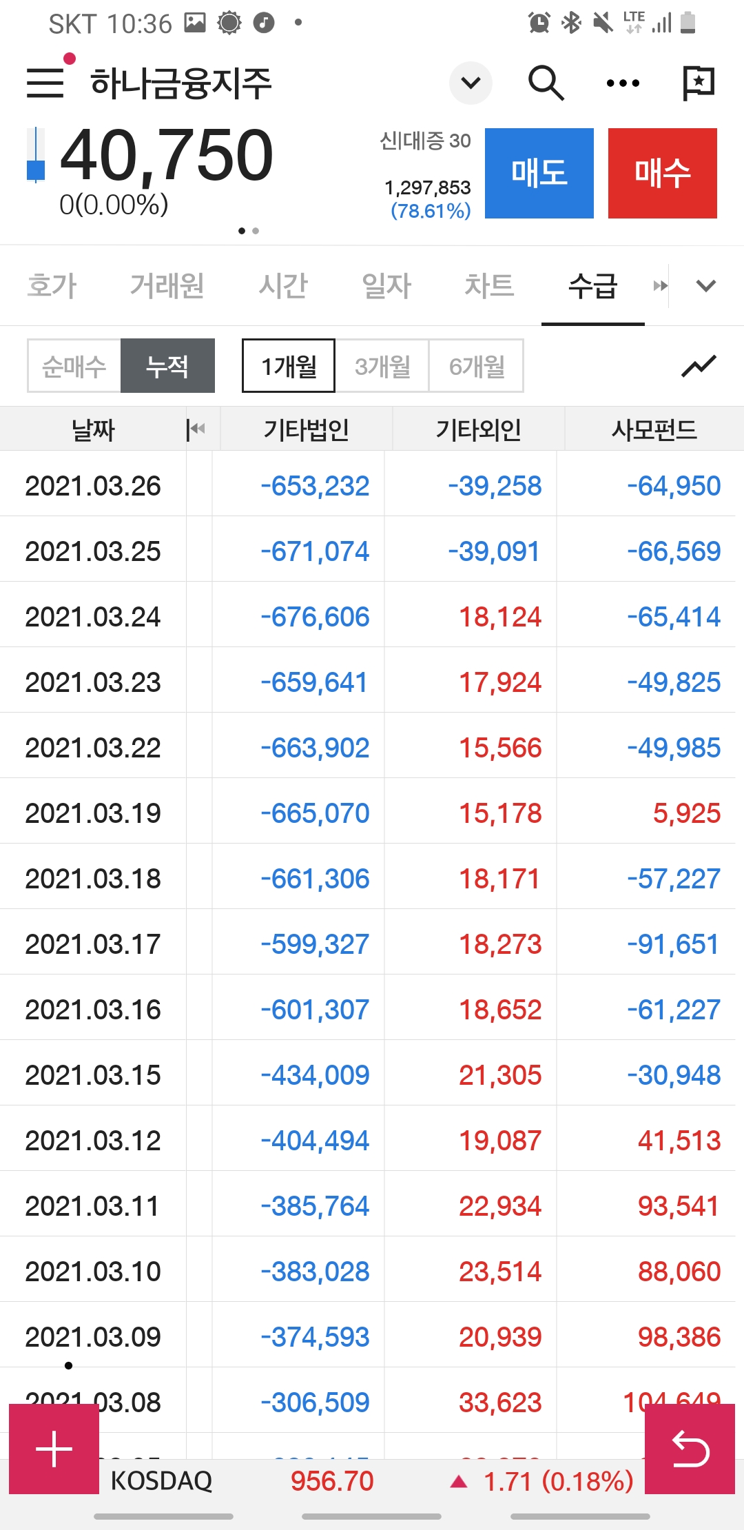 6개월 거래 누적동향에서는 연기금, 보험등등 매도세가 뚜렸했지만요.