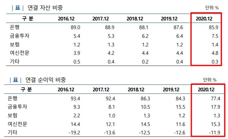 총자산·순이익 가운데 은행 부문 비중 85.9%·77.4%
