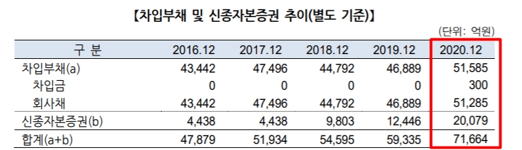 비은행 부문 사업 확대로 인한 자금수요 증가 역시 가시적이다. 지난해 별도 재무제표 기준 이중레버리지비율과 부채비율은 각각 126.5%, 33.7%로 2019년보다 상승했다. 지난해 말 별도 재무제표에 따르면 차입부채와 신종자본 규모는 약 7조2000억원으로 2019년 같은 기간보다 약 21% 늘었다.