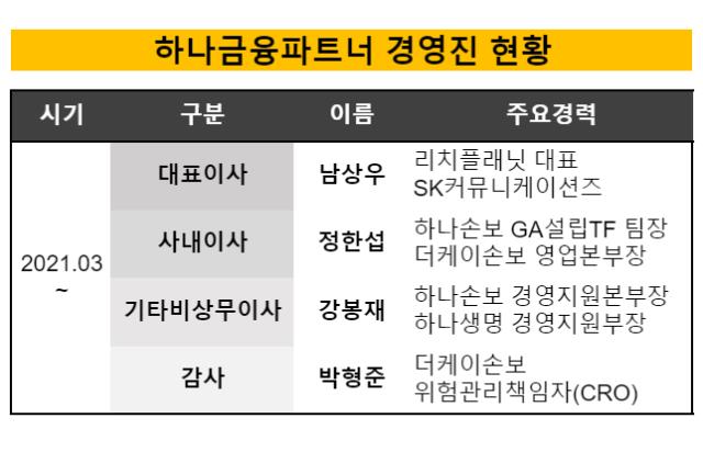 하나손해보험의 판매전문 자회사 '하나금융파트너'가 베일을 벗었다. 남상우 전 리치플래닛 대표를 수장으로 선임하고 더케이손보 출신인 정한섭 상무와 하나금융그룹 출신인 강봉재 상무가 이사회에 합류한다. 외부 출신과 인수법인, 피인수법인 출신을 경영진에 고루 포함했다.