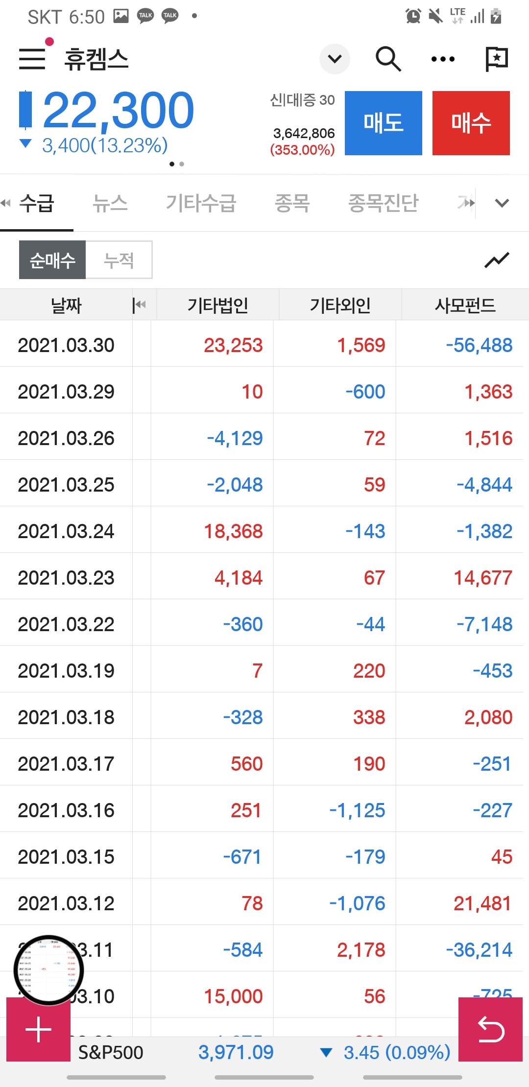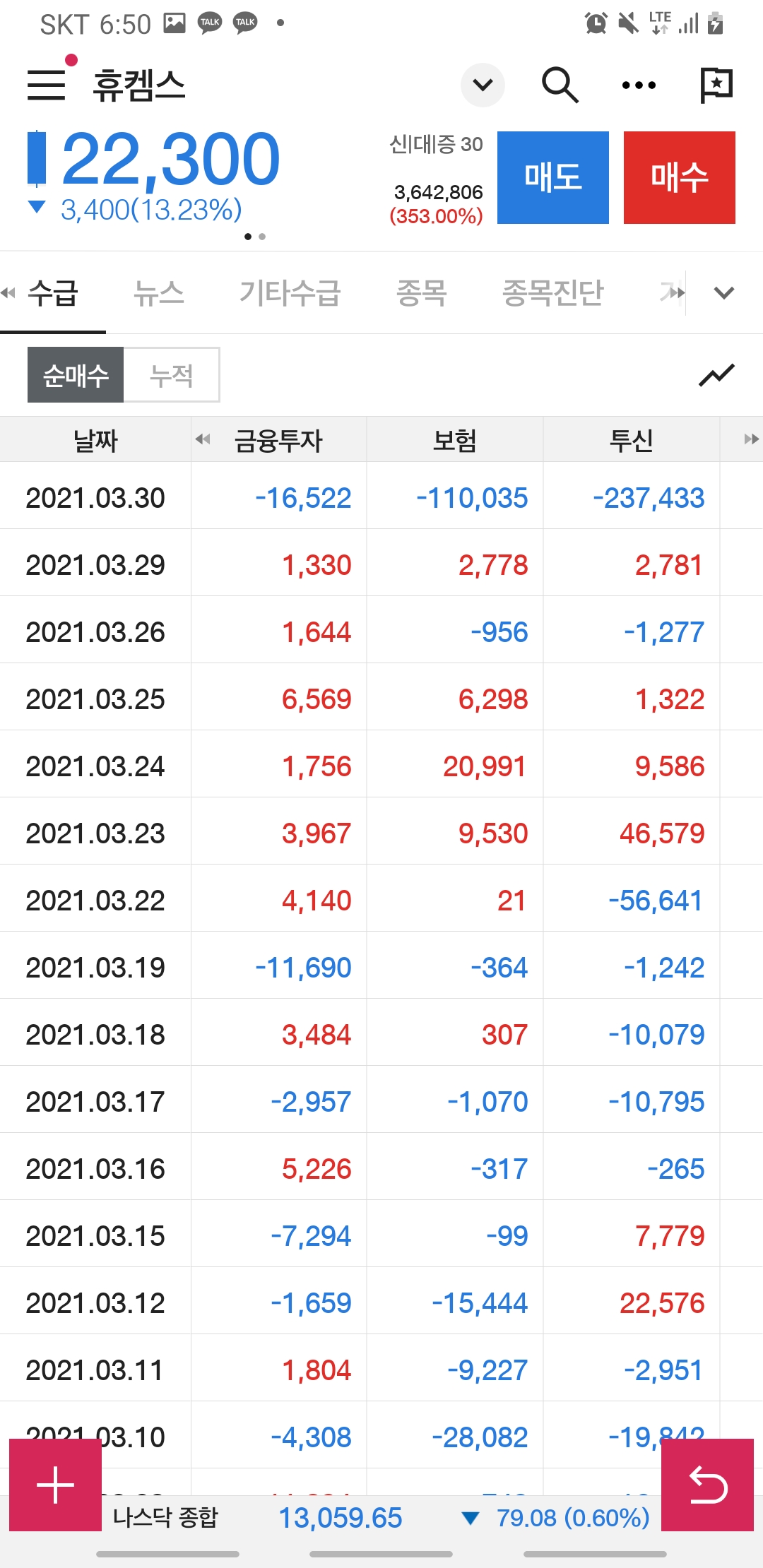 오늘자(2021.3.30) 휴켐스의 수급입니다.