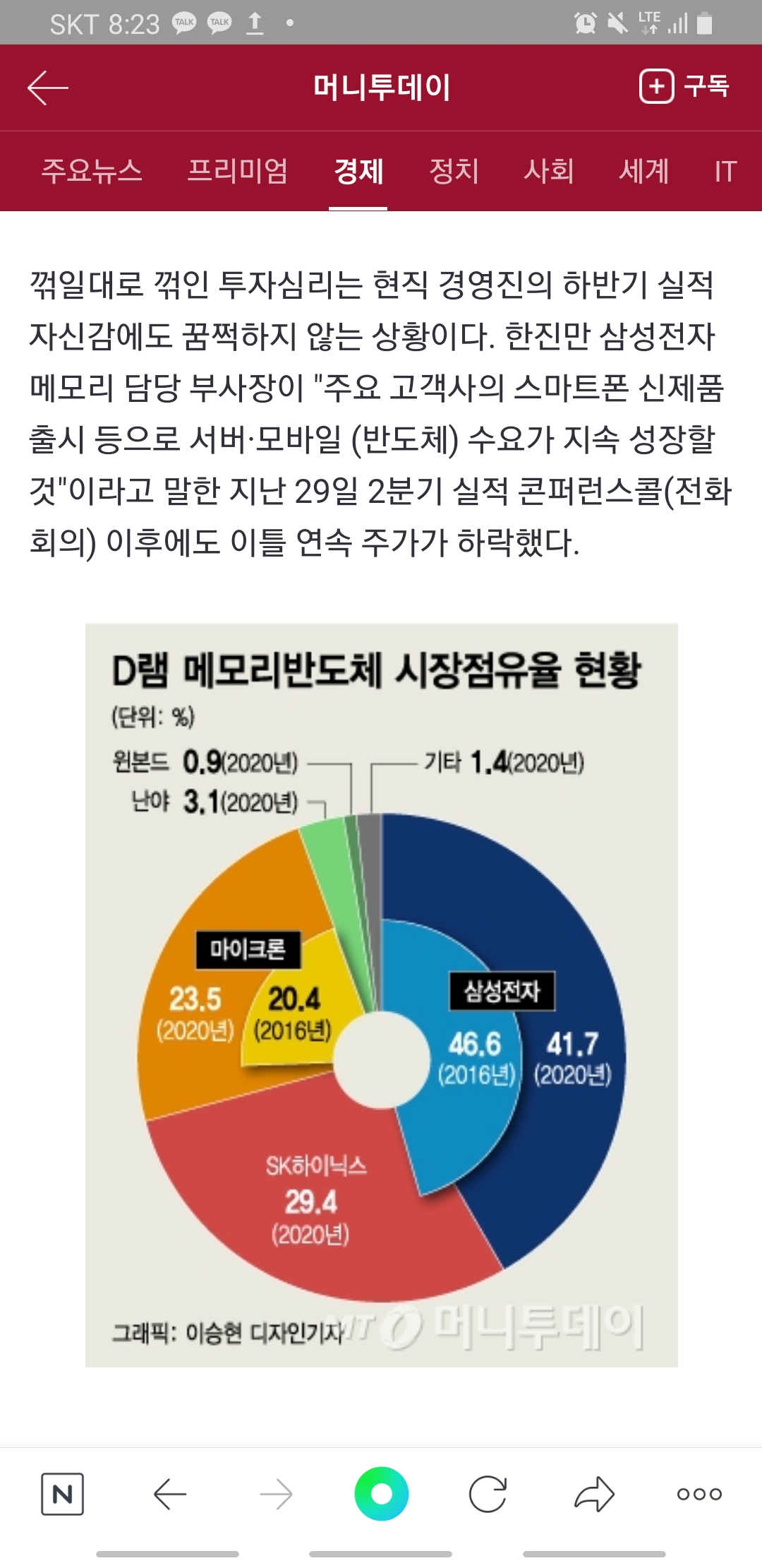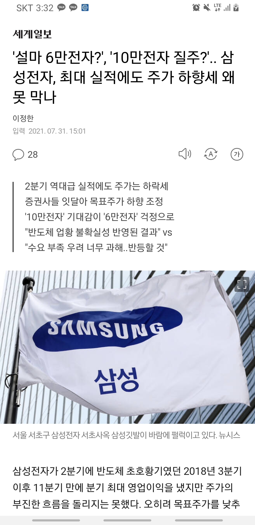 위에 사진들은 어제 카카오톡 메인에 떴던 삼성전자 주가 관련 기사들인데요.