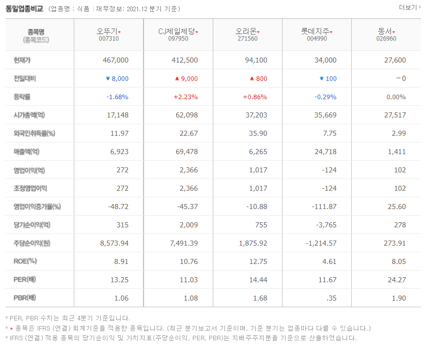 비슷한 식품회사 오리온, 오뚜기, 동서 등과 비교했을때 현재의 밸류가 낮은 편이라고 생각됨.