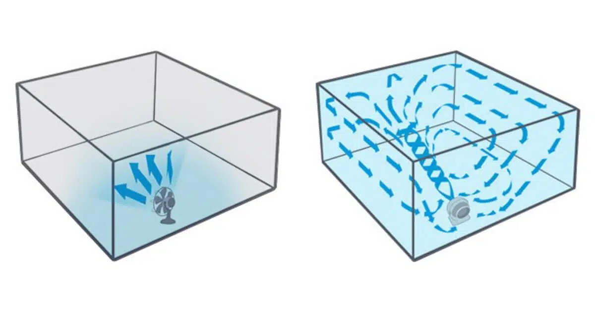선풍기는 주변에 공기를 1m이내의 짧은 거리를 보내서 시원하게 만듭니다.
